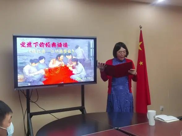 黨旗下的經典誦讀中,黨員和積極分子代表分別誦讀了《艱難的國運與雄健的國民》和《繡紅旗——江竹筠贊歌》,讓大家從思想覺悟上汲取經典的精神養分,一聲聲滿懷激情的誦讀聲獲得與會人員的熱烈掌聲。