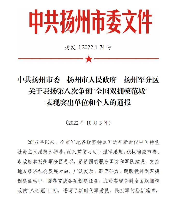 近日,揚州市市委、市政府、軍分區印發《關于表揚第八次爭創“全國雙擁模范城”表現突出單位和個人的通報》,城控集團所屬江蘇長江水務股份有限公司、揚州供熱有限公司兩家單位榮獲爭創“全國雙擁模范城”表現突出單位。