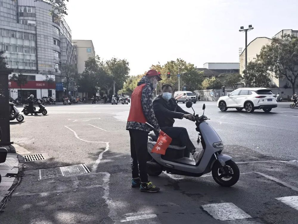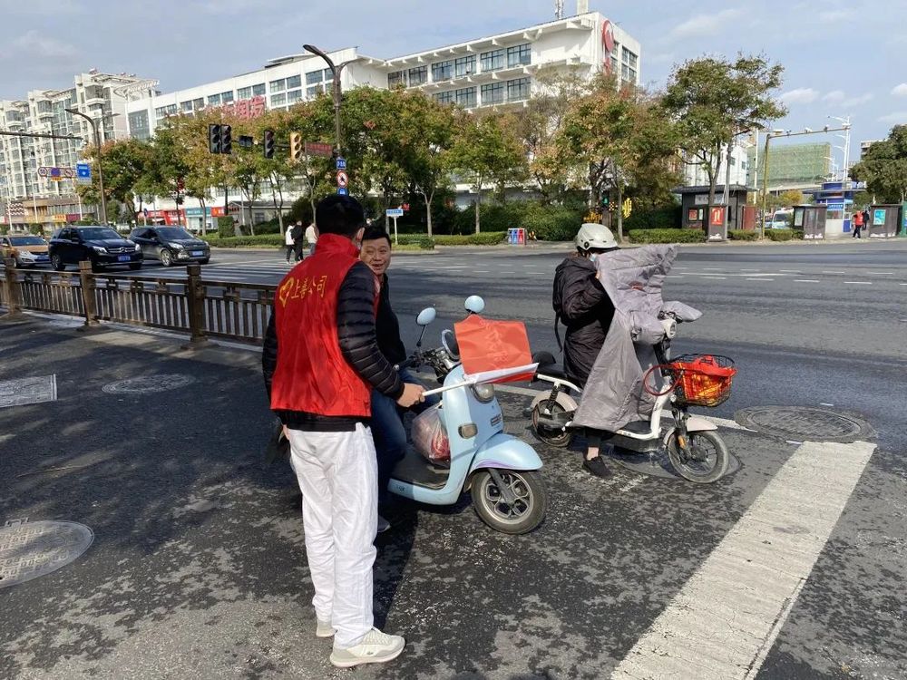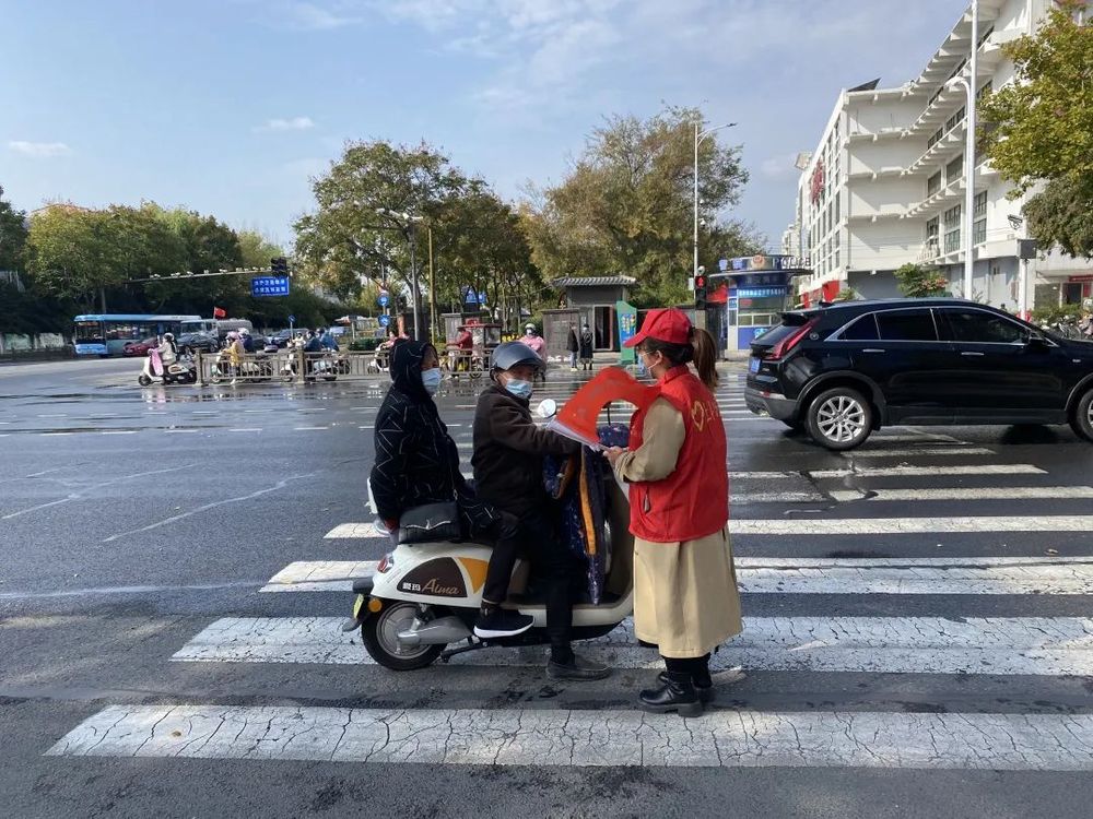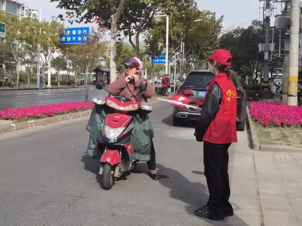 在路口,志愿者身穿紅色馬甲,手拿文明勸導小紅旗,以文明的語言和親切的態度,對越過停止線停車、不佩戴安全頭盔騎行、逆向行駛等不文明交通行為進行及時耐心的勸導,告知其危險性,引導行人安全通過人行橫道。同時,如有腿腳不方便的老人、提重物的行人,也會熱心上前提供幫助,并提醒他們注意交通信號燈,安全過馬路,遇有人問路,志愿者也會耐心指引。