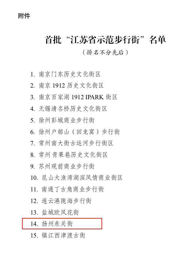 近日,江蘇省商務廳發布《省商務廳關于公布首批“江蘇省示范步行街”名單的通知》,確認揚州東關街等15條步行街為首批“江蘇省示范步行街”。