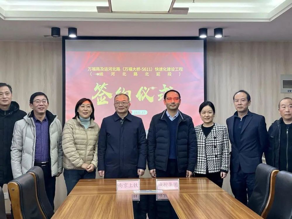 12月30日上午,城控集團與南京上鐵地方鐵路開發有限公司關于運河路北延一期工程代建事宜順利完成簽約。市政府副秘書長裴東偉、城控集團總經理潘涵、南京上鐵公司總經理劉錦軍及市住建局、萬福公司相關負責人出席簽約儀式。