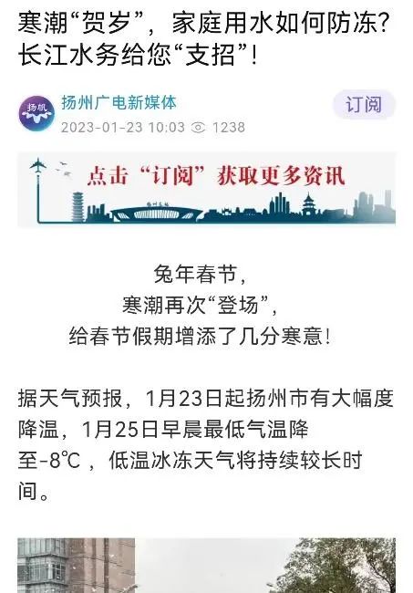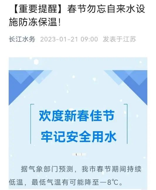 寒潮降溫前,長江水務未雨綢繆,提前準備,加強防凍保溫宣傳,加密信息發(fā)布頻次,有效做好防范工作。春節(jié)前和春節(jié)期間通過手機APP、微信公眾號、電視滾動字幕等渠道,密集發(fā)布30多條自來水設施防凍保溫提醒和安全用水服務通知,全方位提醒居民提前防范。