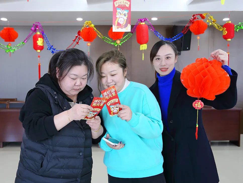 活動現場布置的喜慶熱鬧,一盞盞火紅的燈籠懸掛在大廳,一張張“燒腦”的燈謎垂墜燈籠之下,大家站立在燈籠邊,或獨自凝神思考,或三五成群小聲討論,場面十分活躍,構成了一幅歡樂祥和的畫面。兌獎現場更是排成了長龍,大家憑猜出的謎面,興高采烈在領獎處兌換了獎品。