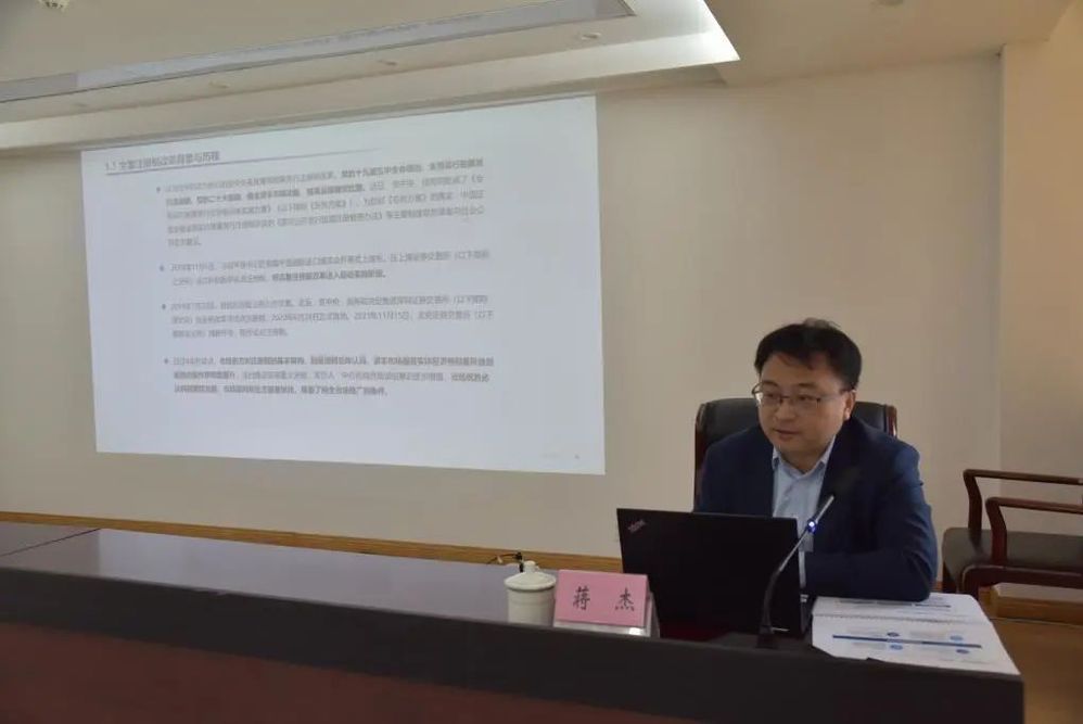國泰君安證券公司蔣杰以《全面注冊制制度規則解讀》為題,介紹了全面注冊制改革總體情況和交易所審核、證監會注冊程序,他以主板上市公司為例,對IPO規則、再融資要點、并購重組、上市公司持續監管規則等方面內容進行詳細解讀。