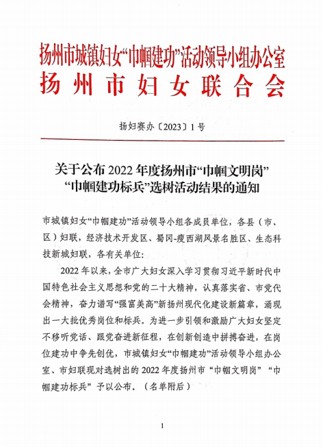 近日,市婦聯(lián)、市婦女“巾幗建功”活動領(lǐng)導(dǎo)小組聯(lián)合表彰了一批揚(yáng)州市“巾幗文明崗”和“巾幗建功標(biāo)兵”。揚(yáng)州市政管網(wǎng)有限公司“890管網(wǎng)服務(wù)隊(duì)”榮獲“巾幗文明崗”稱號。