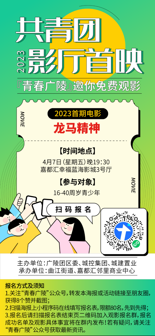 4月7日星期五晚7點半,嘉都匯幸福藍海影城“共青團影廳”將開展首映觀影活動,邀請共青團員、少先隊員、團干部、志愿者等優秀青少年群體參加。