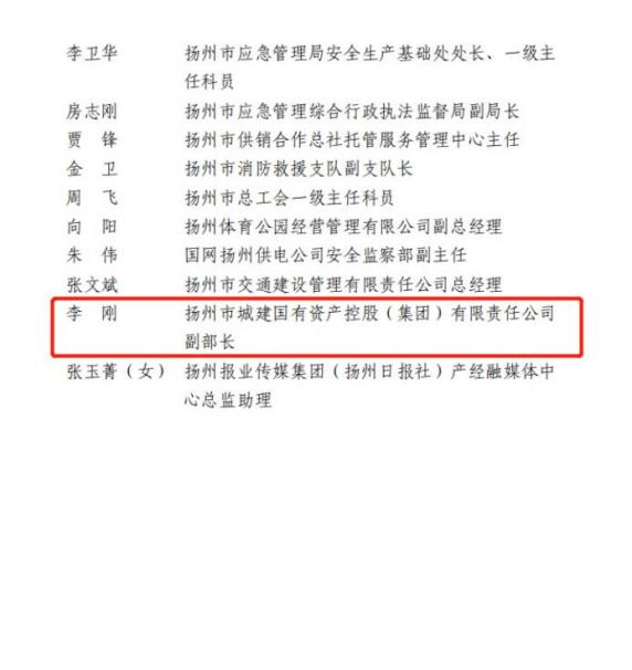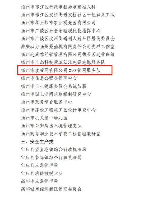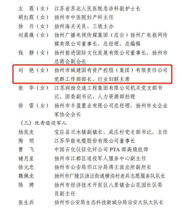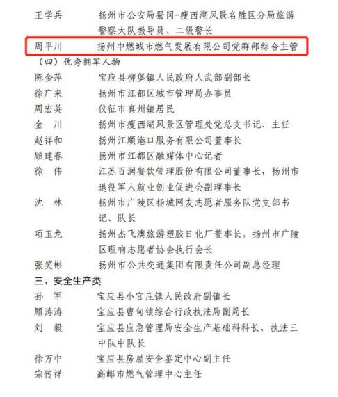 集團所屬揚州市政管網有限公司890管網服務隊獲評“巾幗模范集體”;集團黨群部部長、行業婦聯主席劉艷榮獲“巾幗榜樣”榮譽稱號;集團所屬揚州中燃城市燃氣發展有限公司黨群部主管周平川榮獲“優秀退役士兵”榮譽稱號;集團企管部副部長李剛榮獲“安全生產類先進個人”榮譽稱號。