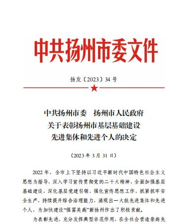 近日,揚州市委、市政府發布《關于表彰揚州市基層基礎建設先進集體和先進個人的決定》,表彰了過去一年在“強富美高”新揚州建設中,在加強基層基礎建設、深化基層黨建引領、強化宣傳思想工作、抓緊抓牢安全生產、持續提升綜合治理能力等多個方面涌現出的一批銳意進取、改革創新、勇于擔當、善于作為的先進集體和先進個人。