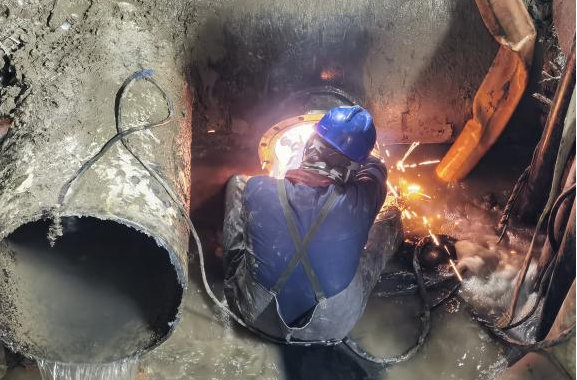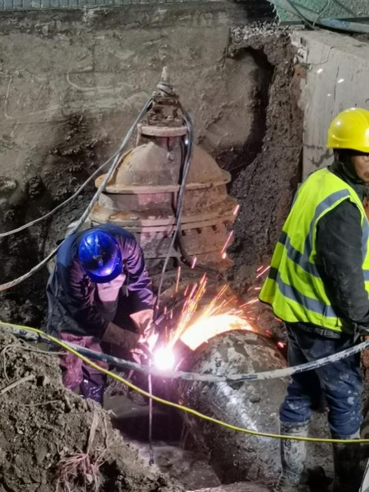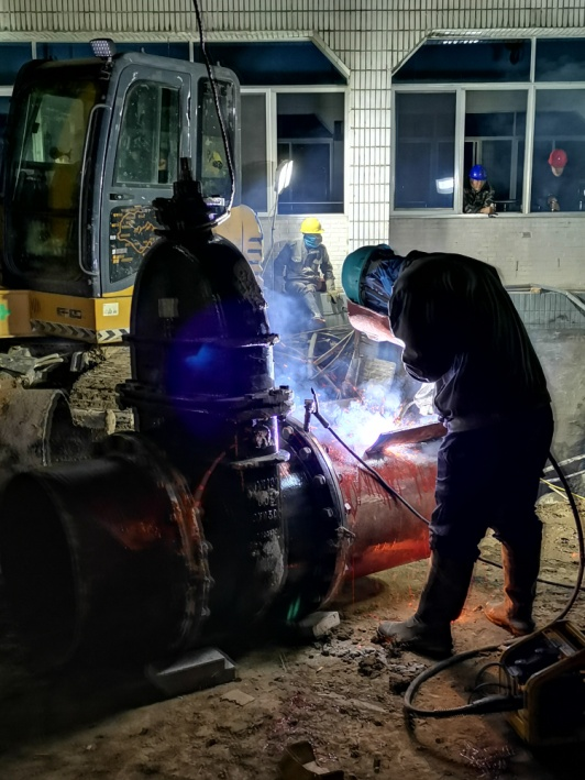 因考慮到本次更換工作作業面小,施工條件差,閥門老舊,施工時長將直接影響第四水廠自來水生產。4月13日上午,公司領導班子成員、施工項目部負責人查勘現場,完善應急保障預案,充分做好技術交底,模排施工流程,所有人員、設備聽令待發,各項準備工作均一一落實落細。下午3點,新裝閥門及管件連接、反光隔離柵欄、切割設備等均放置就位,做好管道碰接最后準備。4月13日20點,施工序幕全面拉開。關閉閥門、排水泄壓、抽排余水、安裝閥門、焊接鋼管、開啟閥門各部門協同配合,現場人員爭分奪秒搶奪進度。