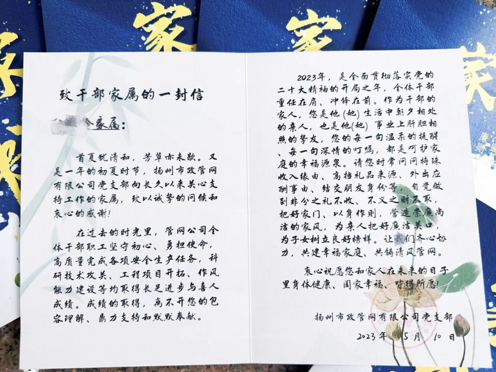 廉潔家書倡導干部職工家屬要筑牢拒腐防變這條重要防線,要守好“幸福門”,樹立正確的金錢觀、權力觀、幸福觀,以德治家、以儉持家、以廉保家;要常吹“廉潔風”,做到在任何情況下,都扛得住誘惑、頂得住歪風、管得住小節;要管好“廉潔賬”,做好對家人“八小時”以外生活圈、社交圈、朋友圈的監督;要當好“廉內助”,讓他們無后顧之憂,廉潔奉公,全心全意投入到工作中。