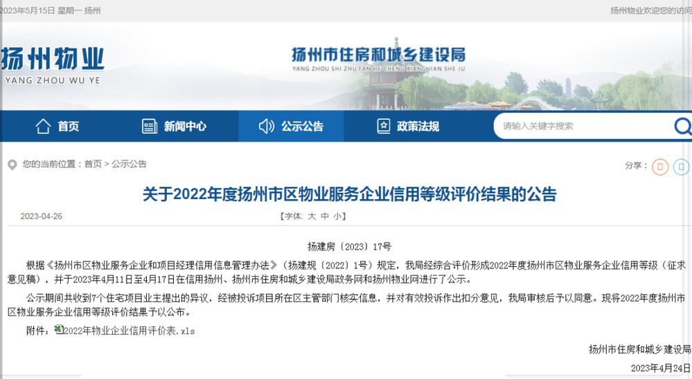 近日,《2022年度揚州市區物業服務企業信用等級》公布,城建物業公司再次獲得揚州市4A級物業服務企業信用等級評定,連續3年在所屬蜀岡瘦西湖景區的11家物業企業信用評級中蟬聯第一,也是景區目前唯一一家AAAA級物業服務單位。
