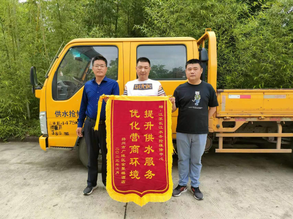 “真的非常感謝你們,為民解憂,徹底解決了我們酒店用水的問(wèn)題!”近日,揚(yáng)州金聚德酒店負(fù)責(zé)人親自來(lái)到立新路,將一面印有“提升供水服務(wù) 優(yōu)化營(yíng)商環(huán)境”的錦旗送到了長(zhǎng)江水務(wù)搶維修中心,感謝水網(wǎng)先鋒搶修隊(duì)員為該酒店解決了水壓?jiǎn)栴}。