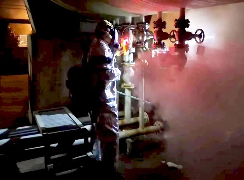 晚上9時,夜間演練正式開始?,F場巡查人員發現1#儲罐法蘭連接處突發泄漏,并報告應急指揮組,應急指揮組立即啟動應急處置預案,巡查人員用厚毛巾纏繞泄漏部位,開啟噴淋水,確保泄漏點凍結,再向罐內注水,搶修人員穿戴防護裝備、攜帶搶修設備進入現場,對泄漏點進行搶修。隨后對儲罐進行倒罐作業,在該儲罐壓力低于0.05MPa后,放散結束后,再進行搶修作業。