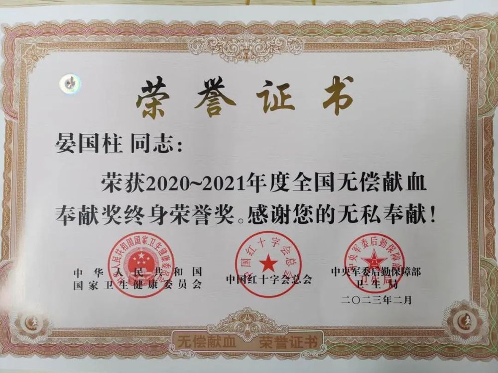 點滴熱血,“輸”寫大愛。日前,供熱公司“暖揚”服務隊隊長晏國柱同志被國家衛生健康委、中國紅十字總會、中央軍委后勤保障部衛生局聯合授予“無償獻血奉獻獎終身榮譽獎”。