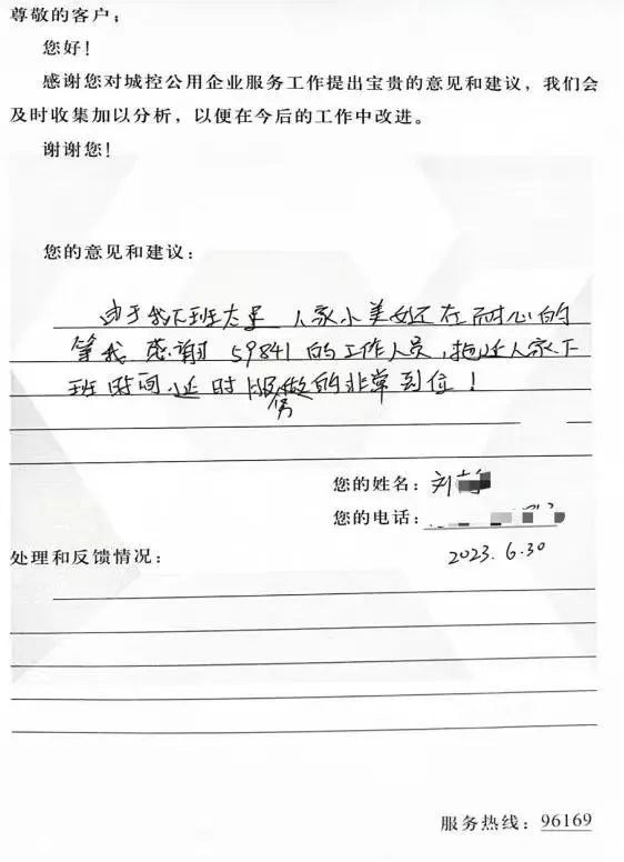 “太感謝你們了,本來(lái)以為下班辦理不了業(yè)務(wù)呢,沒(méi)想到工作人員加班為我辦理了自來(lái)水繳費(fèi)業(yè)務(wù),不用再多跑一趟了,真是太貼心了。”一位前來(lái)自來(lái)水營(yíng)業(yè)大廳辦理業(yè)務(wù)的企業(yè)用戶激動(dòng)地說(shuō)到。