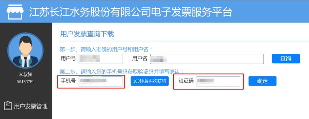 第二步:在用戶號和用戶名后的文本框內輸入用戶相關的正確信息,并點擊查詢按鈕,輸入正確信息后,會顯示輸入手機號和驗證碼的文本框,申請人將自己的手機號輸入文本框,然后點擊獲取驗證碼(驗證碼在獲取后180秒內無法再次獲取)