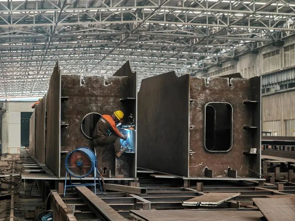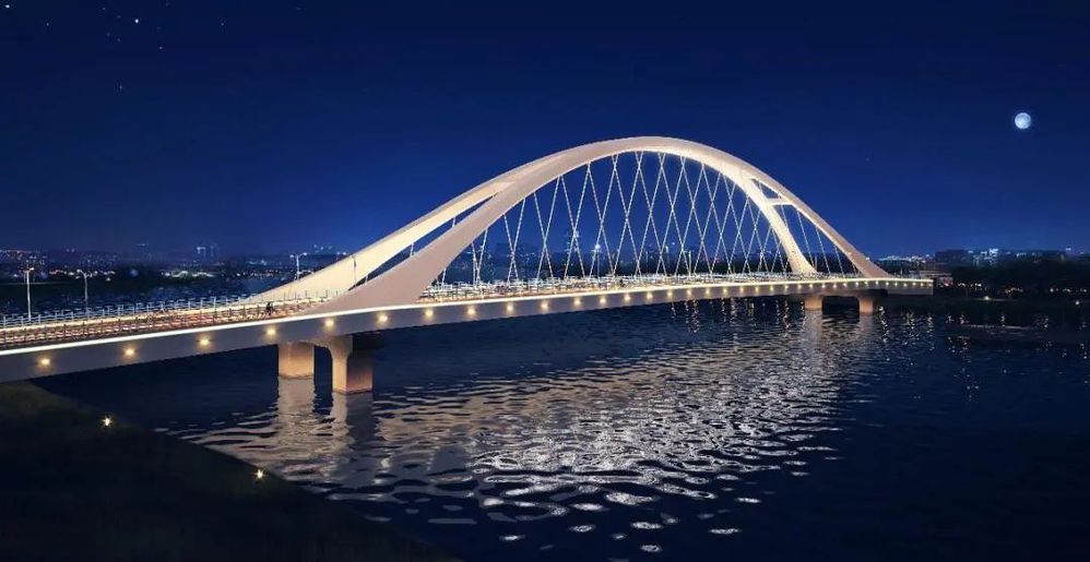 橋梁主拱內(nèi)傾呈提籃式外觀,線型控制將成為本橋施工把控重點(diǎn)。目前,主墩下部結(jié)構(gòu)已完成施工,主橋鋼結(jié)構(gòu)4114噸材料已全部進(jìn)場(chǎng),主橋鋼支撐施工、構(gòu)件拼裝等施工工序穩(wěn)速推進(jìn)中。