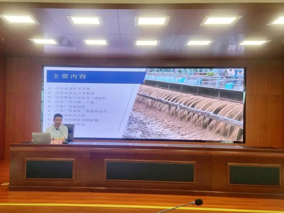 培訓邀請了揚州大學環境科學與工程學院副院長、教授吳軍進行授課。吳教授從厭氧氨氧化自養脫氮、好氧顆粒污泥技術 (AGS)、污水廠的節能, 產能、污水廠資源回收、污水廠精細化,智能化運行、新污染物的去除、進水無機顆粒物的影響和溢流污染的控制等多個方面對污水處理技術進行了生動講解,并為技術人員答疑解惑,現場研學氛圍濃厚。