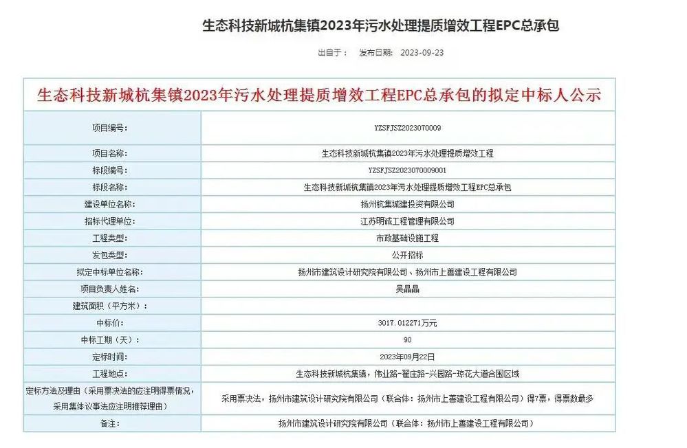 近期,上善公司再次成功中標(biāo)生態(tài)科技新城杭集鎮(zhèn)污水處理提質(zhì)增效工程,中標(biāo)金額3017萬元。