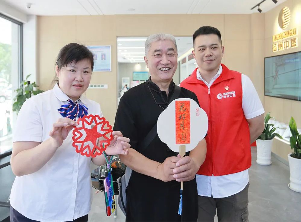 團扇寓意著團團圓圓、家庭美滿、闔家歡樂。貼上萬年紅方宣,飽蘸一得閣墨汁,中秋安康,平安喜樂,氣聚人和、但愿人長久、千里共嬋娟……一幅幅墨寶被志愿者賦予了濃情和溫度,一張張笑臉隨筆墨齊飛揚。前來辦理業務的戚女士也是書法愛好者,與志愿者們交流切磋,現場即興書寫了一把小楷“花好月圓”團扇,開心地說:感謝揚州中燃提供的互動平臺,過了一把癮;印刷的書畫團扇花錢隨處都能買到,但我還是喜歡手寫的,有溫度、接地氣,每一幅都是獨一無二的,福氣滿滿、韻味濃濃。