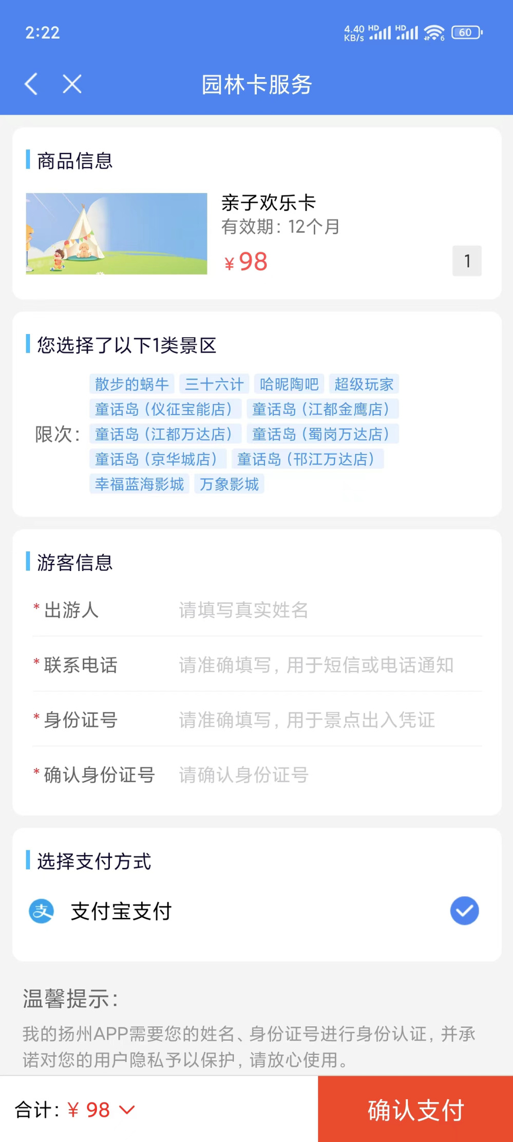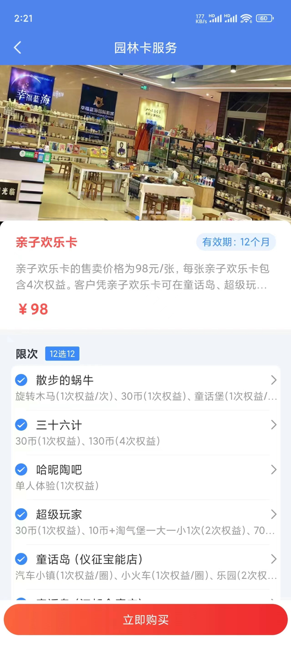 親子歡樂卡的售賣價格為98元/張,每張親子歡樂卡包含4次權益。