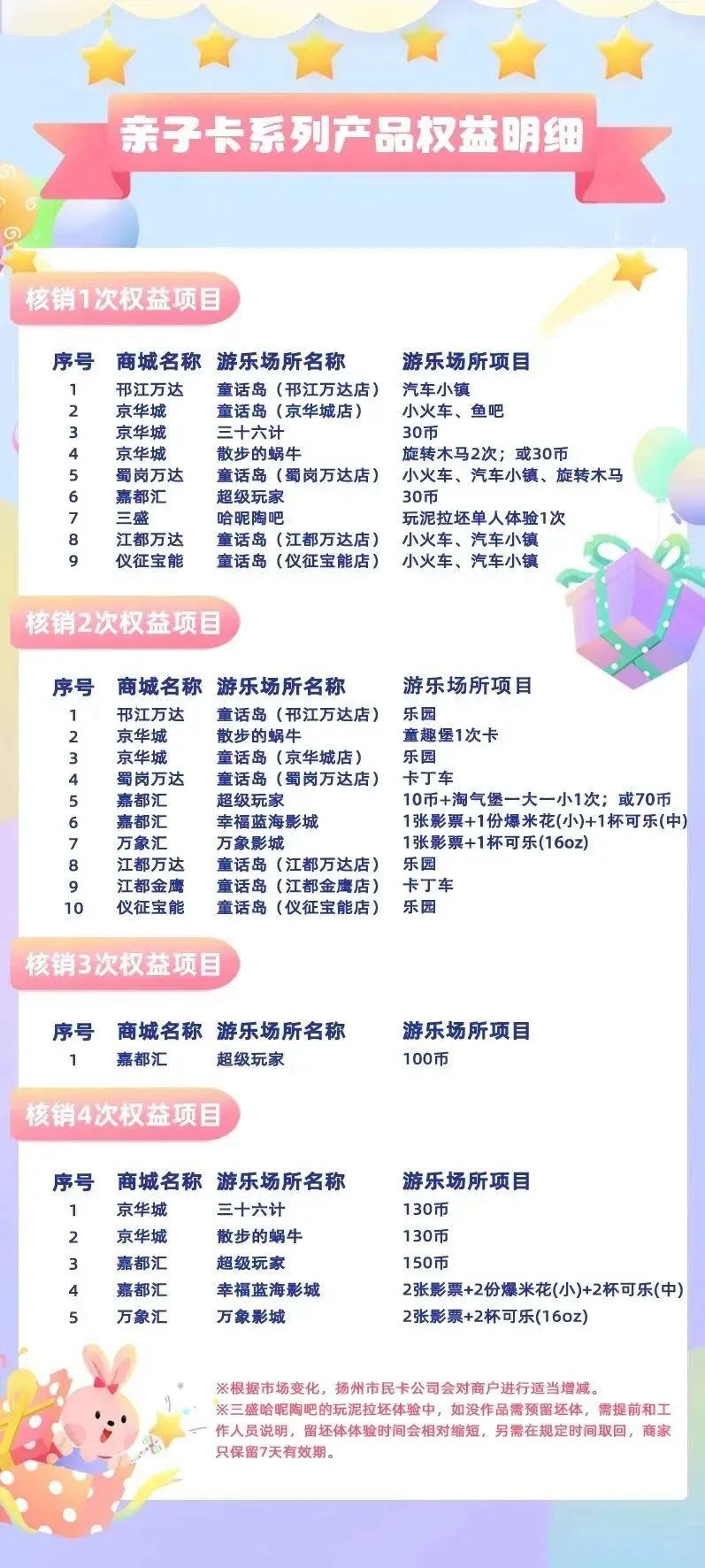 各商戶提供游玩項目,需扣除相應的權益次數(shù)。權益次數(shù)至購買日起一年內有效。