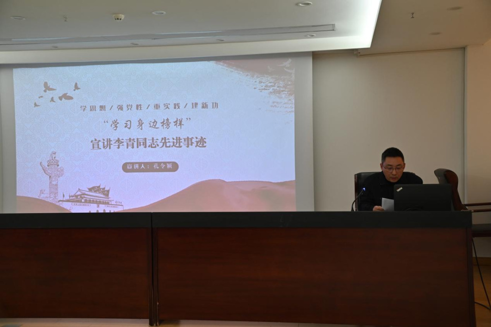 隨后,由長江水務第五黨支部副書記孔令穎同志宣講“學習身邊榜樣”——李青同志先進事跡,用樸實的語言、生動的例子、真實的情感講述了李青30年如一日為民服務的初心故事。