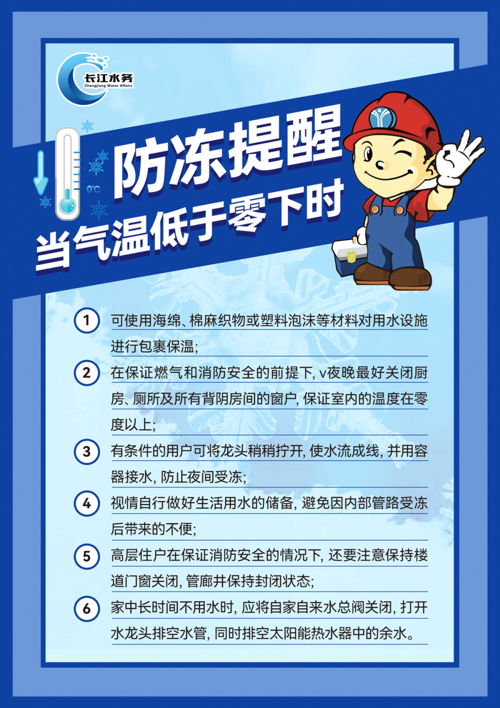 天氣預報12月中下旬我市遭遇寒潮,最低氣溫可能降至-7℃,為了滿足市民的日常生活用水需求,長江水務公司提前部署防凍保溫保供工作,全力以赴筑牢水龍頭、水管、水表的“溫暖防線”。
