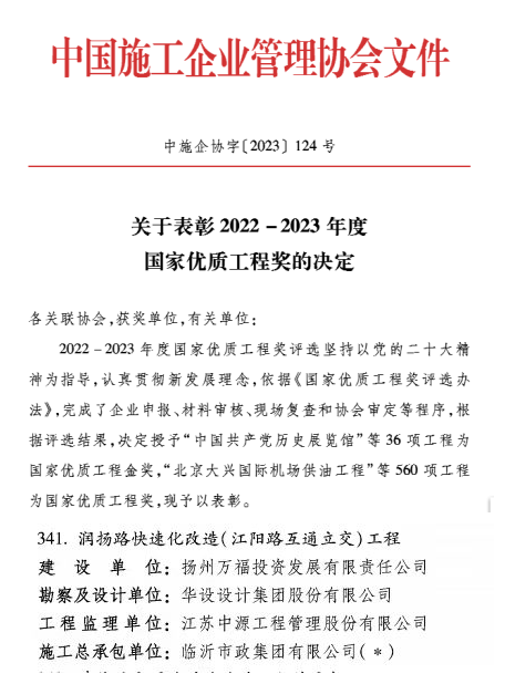 近日,中國施工企業(yè)管理協(xié)會發(fā)布《關(guān)于表彰2022-2023年度國家優(yōu)質(zhì)工程獎的決定》,潤揚路快速化改造(江陽路互通立交)工程榮獲2022—2023年度第一批國家優(yōu)質(zhì)工程獎。這是萬福公司繼萬福大橋工程榮獲2020-2021年度第一批國家優(yōu)質(zhì)工程獎后,再一次榮獲該獎項。