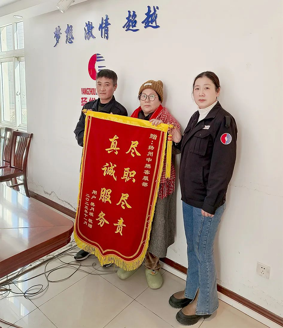 日前,市區(qū)天然氣用戶樊女士將一面印有“盡職盡責(zé) 真誠(chéng)服務(wù)”的錦旗送到了揚(yáng)州中燃公司,對(duì)客服部工作人員快速響應(yīng)用戶需求、提供優(yōu)質(zhì)服務(wù)表示感謝。
