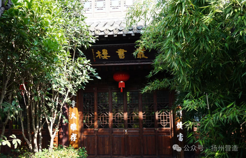 通過曲廊,走近叢書樓,樓前集句楹聯(lián)“學(xué)業(yè)醇儒富,文章大雅存”分列兩旁。樓宇高暢,上下兩層,朝南七間,硬山頂,雕花槅扇門窗,古色古香。清代學(xué)者袁枚說:“山館玲瓏水石清,邗江此處最知名。攢陳圖史常千架,供養(yǎng)文人過一生。”
