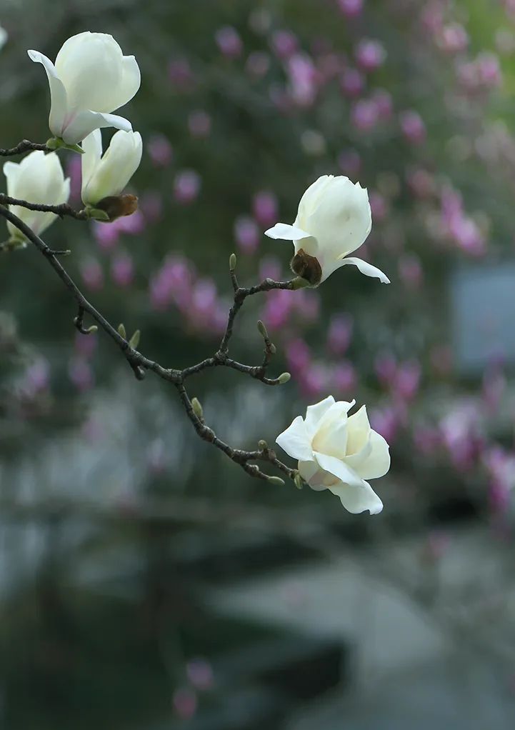 春風(fēng)輕拂,小秦淮河兩岸一株株玉蘭花樹傲然挺立,似白鴿飛舞、如彩蝶翩翩,讓人感受到了溫暖和陪伴。白色的花朵玉潔冰清、輕盈純凈,紫色的花朵燦若云霞、風(fēng)姿綽約,它們相約悄然綻放,以最溫婉的方式宣告春暖花開,以最熱情的方式喜迎賓朋。