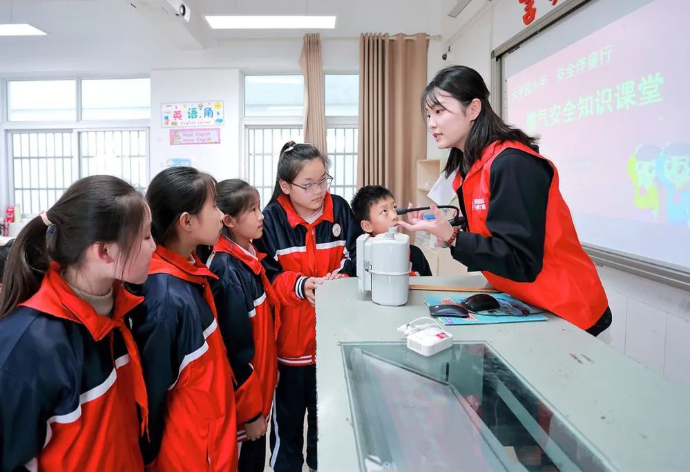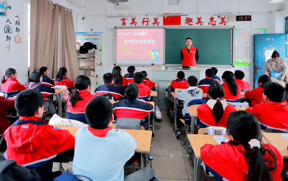 課堂上,揚(yáng)州中燃公司藍(lán)焰朝陽(yáng)志愿者帶著學(xué)生們一起學(xué)習(xí)燃?xì)獍踩R(shí)、應(yīng)急防范措施和家用燃?xì)狻叭住钡陌卜拦δ堋1绕鹬蛔寣W(xué)生現(xiàn)場(chǎng)聽(tīng)講,志愿者徐源更重視學(xué)生們的近距離體驗(yàn),“我們走下講臺(tái),模仿戶內(nèi)燃?xì)庑孤r(shí)的錯(cuò)誤做法及危害性;讓學(xué)生們走上講臺(tái),了解和掌握燃?xì)獍l(fā)生泄漏如何正確應(yīng)對(duì)、家中燃?xì)馊绾尾槁⑷細(xì)饩吆瓦B接管的使用年限……通過(guò)宣傳和實(shí)踐讓學(xué)生們認(rèn)識(shí)到安全就在身邊。”
