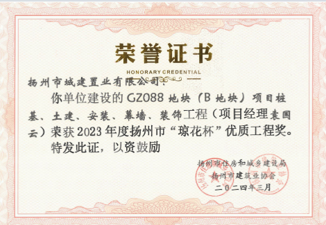 近日,揚州市建筑業協會傳來喜訊,由置業公司開發的GZ088地塊嘉都匯項目榮獲“2023年度揚州市瓊花杯優質工程獎”。