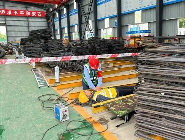 此次演練分為基坑坍塌視頻培訓(xùn)、高溫中暑桌面演練、觸電救援實(shí)操演練三個(gè)環(huán)節(jié)進(jìn)行。其中,實(shí)操演練模擬拖地電線造成一名鋼筋工觸電。現(xiàn)場指揮、警戒疏散、醫(yī)療救護(hù)、事故調(diào)查、通訊聯(lián)絡(luò)等工作小組按照應(yīng)急救援方案快速響應(yīng),依次有序開展救援工作。