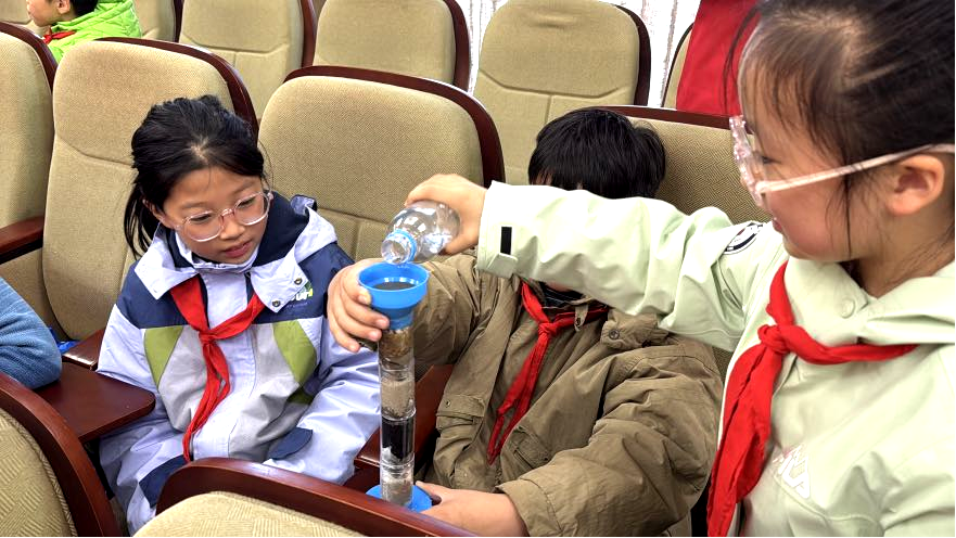 隨著過濾裝置制作完成,小記者們將臟水緩緩倒入過濾器,緊盯著水流經過每一層過濾材料,經過實驗裝置的處理,原本渾濁的臟水逐漸變得清澈透明。“哇,水真的變清了!”當清澈的水從過濾器底部緩緩流出時,不少同學驚呼出聲,臉上洋溢著喜悅的笑容。“我覺得這個實驗太神奇了!沒想到經過簡單的幾個步驟,就讓水質有了明顯改善。”梅嶺小學四(10)班的劉同學激動地說道。小記者們紛紛表示,此次科普活動不僅讓他們了解了飲用水安全的重要性,還在實踐中培養了觀察、思考和動手的能力。在活動的最后,現場進行了有獎問答環節,小記者們都非常踴躍地回答問題,大家對于制水、凈水、節水,都有了更加深刻的理解。