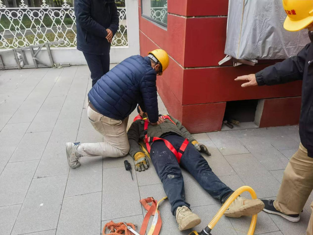 本次演練模擬石油新村供暖小區半通行地溝內供暖管道泄漏,供熱公司第三方維保單位1名作業人員進入半通行地溝進行施工,作業人員因長管呼吸器被工具擠壓導致窒息暈倒,監護人員同步立即報警并上報事故,隨即應急指揮小組立即啟動應急預案,組織力量開展有限空間應急救援行動。