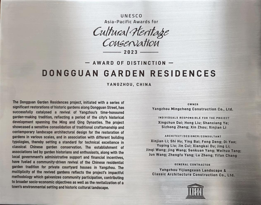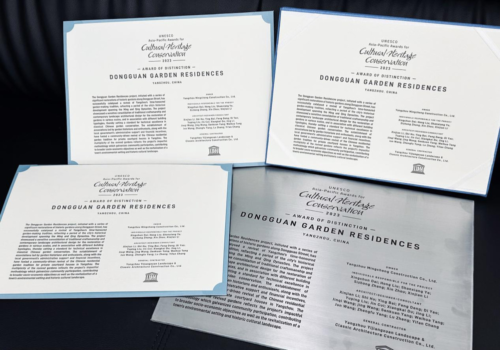 亞太文化遺產保護獎是由聯合國教科文組織發起的區域性獎項,旨在表彰亞太地區個人及公私部門在保護或恢復區域具有遺產價值的建筑、場所和不動產方面取得的成就,以鼓勵個人參與及公私合作,保護本地區的文化遺產,造福今世后代。2023年12月21日,揚州城控集團申報的“揚州東關街園宅保護與傳承復興項目”從亞太地區8個國家48個參賽項目中脫穎而出,斬獲聯合國教科文組“2023年度亞太文化遺產保護獎杰出獎”,是中國唯一獲得“杰出獎”的文保項目。聯合國教科文組織在項目評審語中寫到“東關歷史文化街區是傳統文化與當代景觀設計的完美結合,為亞太地區古典園林保護及活化利用提供了重要參考”。