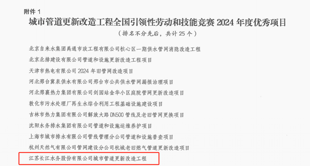 近日,中國海員建設工會全國委員會發文表彰,江蘇長江水務股份有限公司老舊小區給水管道及配套設施改造工程榮獲城市管道更新改造工程全國引領性勞動和技能競賽2024年度優秀項目,全省唯一獲此殊榮單位。