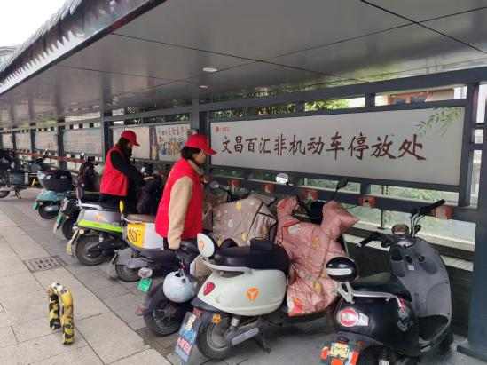 志愿者們身穿紅色馬甲,手持清理工具,細致打掃街區小區內道路、清理枯枝落葉、撿拾綠化帶垃圾,將停放雜亂的電動車整齊地擺放在停車區域,對于阻擋消防通道的電動車,志愿者們通過張貼溫馨提示等方式,引導商戶居民規范停車,關注消防安全。
