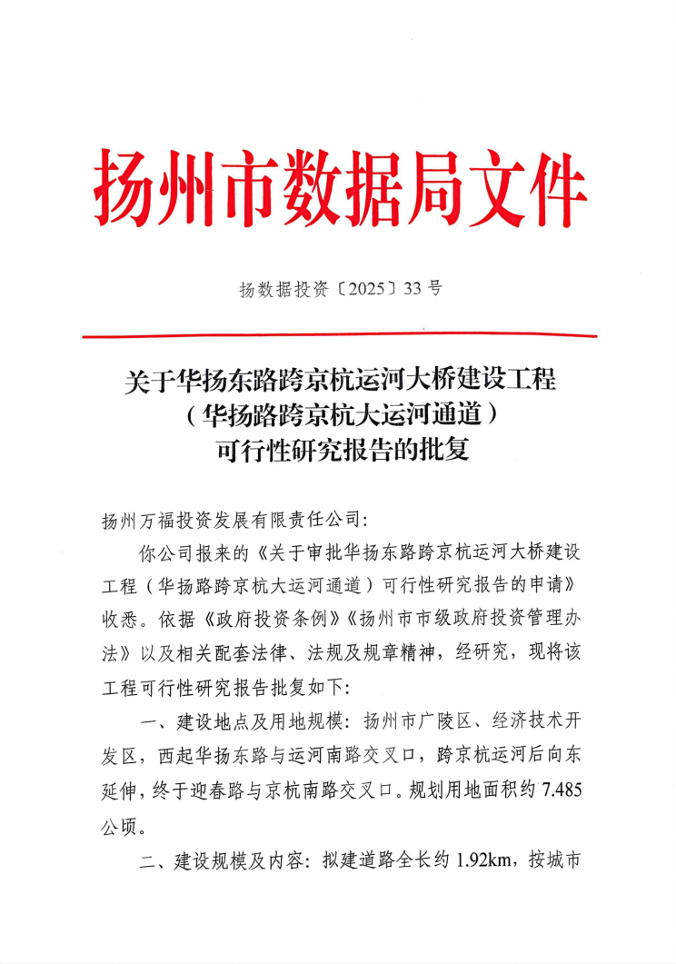 3月28日,華揚東路跨京杭運河大橋建設工程順利取得可行性研究報告批復,標志著這項城建重點市政項目前期工作全面啟動。