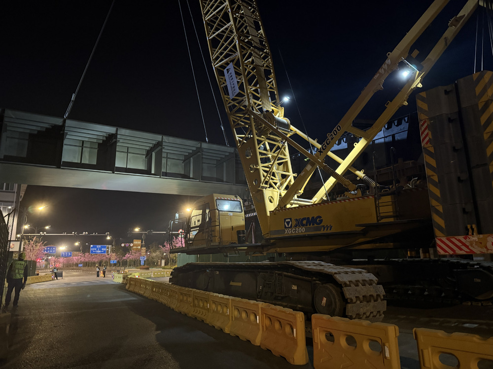 涉鐵段鋼箱梁共計三跨一聯,共49個節段,采用場內分節分段焊接制作,200t履帶吊進行吊裝、焊接。鋼箱梁橋跨組合為33.5+62+33.5m,橋寬25.66m,梁高2.6m,總重量約1933t。自3月12日首節段開始安裝以來,短短十幾天時間內,項目部克服了施工條件受限、項目技術難點多、施工風險高、交通導行壓力大等諸多困難,精心組織,科學安排,圓滿完成了鋼箱梁的合龍工作。