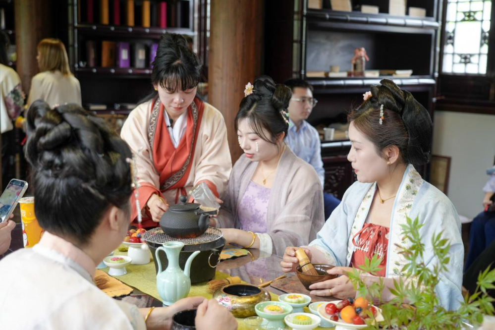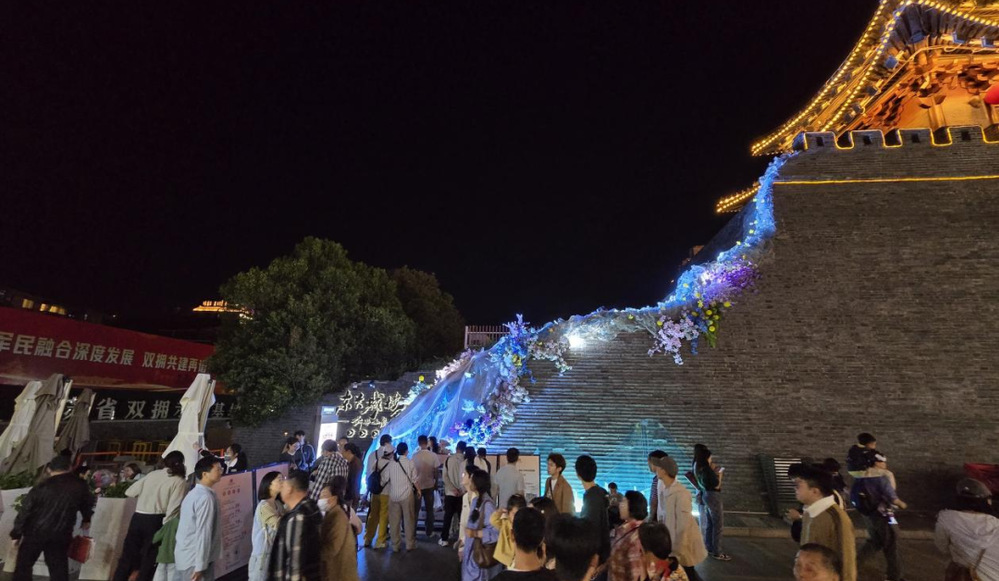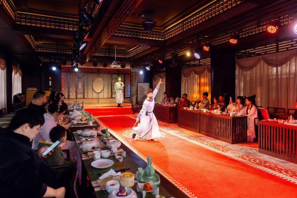 從謝馥春香粉店旁的“淮揚(yáng)早茶體驗(yàn)區(qū)”到街尾的“老字號(hào)美食長(zhǎng)廊”,街區(qū)串聯(lián)起揚(yáng)州美食文化精髓。三和四美醬園現(xiàn)場(chǎng)熬制“櫻花腐乳”,將傳統(tǒng)工藝與春日風(fēng)物融合;揚(yáng)大酸奶、漢森熊啤酒等網(wǎng)紅美食與霸王茶姬國(guó)風(fēng)茶飲形成混搭風(fēng)潮,滿足年輕群體的多元需求。夜經(jīng)濟(jì)版圖持續(xù)拓展:芍藥園子書(shū)場(chǎng)評(píng)話聲聲入耳,長(zhǎng)樂(lè)鹽商宴再現(xiàn)鹽商雅集盛景,形成日賞非遺、夜享雅韻的全時(shí)段體驗(yàn)閉環(huán)。數(shù)字科技為古街注入新活力,街區(qū)東門(mén)城樓引入VR全景漫游、AI互動(dòng)等前沿技術(shù),在東關(guān)城樓打造《創(chuàng)世·山海經(jīng)》沉浸式數(shù)字文化展,吸引約3000名游客穿越上古神話世界,虛實(shí)相生的光影藝術(shù)讓傳統(tǒng)文化煥發(fā)時(shí)尚魅力。