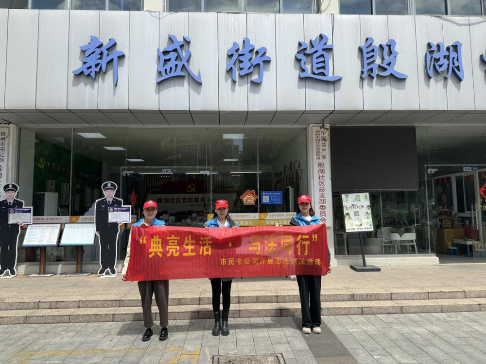 今年5月是第五個“民法典宣傳月”,為深入推動《民法典》宣傳教育工作走深走實,市民卡公司“e飛揚”志愿服務隊走進新盛街道殷湖社區為群眾開展與“法”同行、“典”亮生活主題宣傳活動,引導群眾辦事依法、遇事找法、解決問題用法、化解矛盾靠法,鼓勵群眾多運用法律維護自身合法權益。
