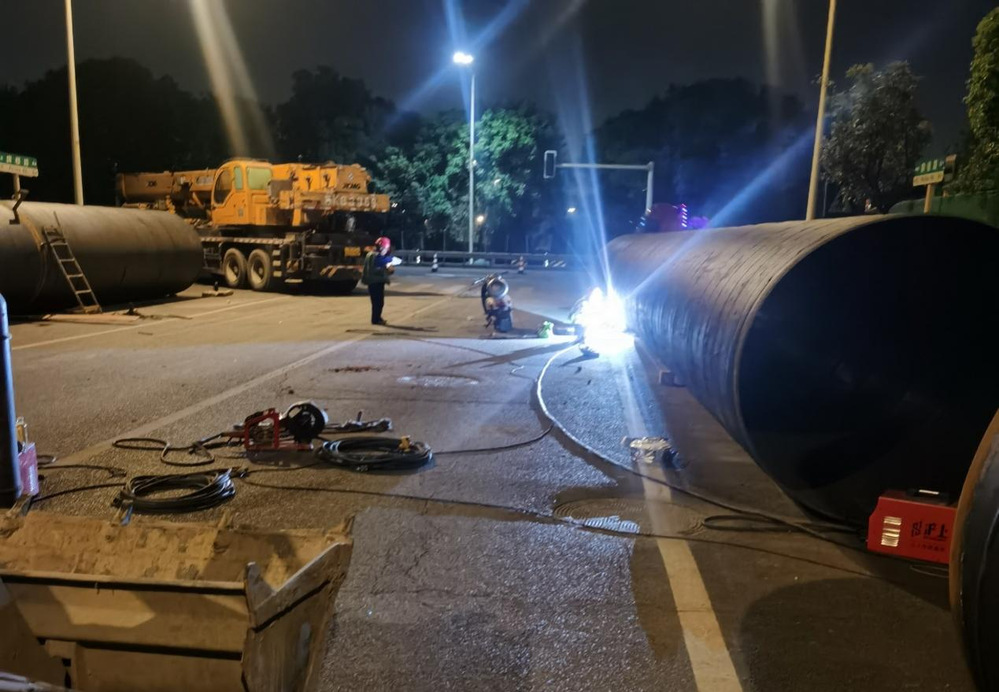 在管道焊接環(huán)節(jié),本項目DN1800污水管道采用雙管敷設(shè),DN2000鋼套管內(nèi)嵌DN1800污水管,創(chuàng)新采用“地面預制+整體吊裝”工藝,將15米雙管在地面焊接成型后,由兩臺50噸吊車協(xié)同作業(yè)精準下放。為確保零滲漏,項目團隊在雙管間隙注入高壓水泥漿,形成雙重密封,噴淋系統(tǒng)、霧炮車全天候抑塵,基坑積水即時抽排,有力實現(xiàn)了揚塵不擴散、泥水不外流。