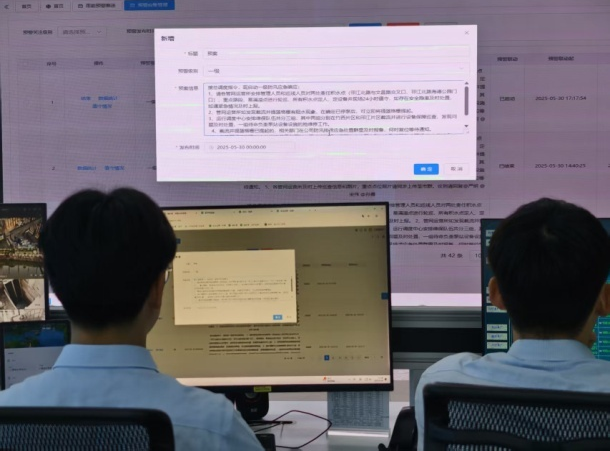該環節為線上演練,模擬揚州市氣象臺發布暴雨橙色預警,市防汛指揮部啟動Ⅲ級應急響應。收到預警信息后,公司防汛總調度部門通過“城排通”系統發布雨前預警通知,提醒生產部門雨前需準備工作,包括污水設施巡查、設備維保、物資保障、應急值守等內容。公司防汛排澇總調度根據雨情及時啟動一級應急響應,各生產部門按照指令立即部署各項工作,并通過手機APP端將現場情況實時上傳至“城排通”系統防汛平臺。