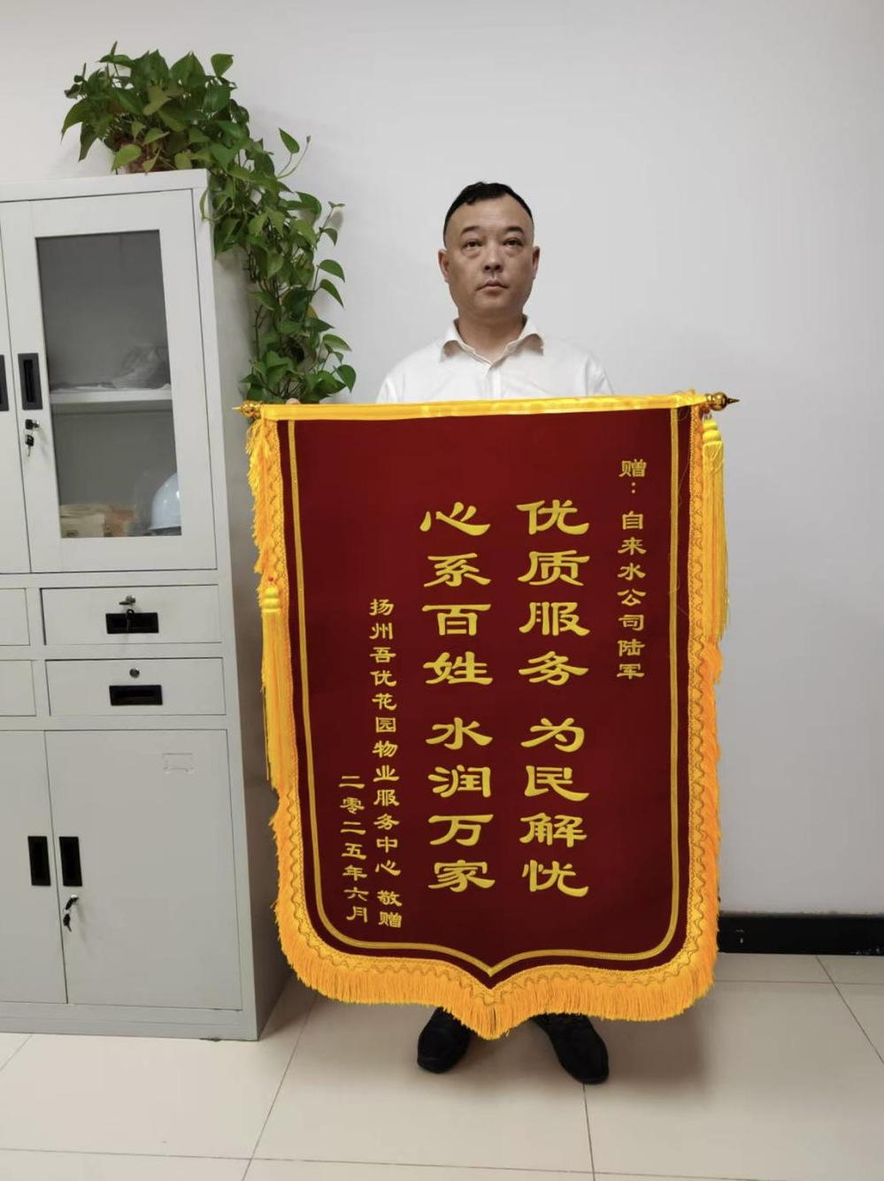 2025年6月13日下午,長江水務(wù)營業(yè)所稽查科迎來一位特殊訪客——吾優(yōu)花園小區(qū)物業(yè)人員。他們?yōu)榛榭瓢嚅L陸軍送來錦旗,致謝其心系用戶、為民解憂的實干精神。