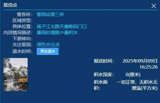 公司依托“城排通”智慧管理,對管網(wǎng)運行狀態(tài)進行實時監(jiān)測。在關鍵節(jié)點安裝雨量傳感器、流量計、液位計等感知設備收集雨情、水情、管網(wǎng)液位等數(shù)據(jù),及時上傳至管理平臺,一旦數(shù)據(jù)超出預警閾值,系統(tǒng)自動報警,快速定位,為防汛決策提供科學依據(jù)。通過平臺,可遠程調度應急設備與人員,實時查看重點點位現(xiàn)場情況,實現(xiàn)精準指揮,使防汛從“被動處置”轉向“主動預警”,大大提高了防汛工作效率。同時,公司注重歷次雨后復盤,使用“城排通”系統(tǒng)防汛板塊及時進行雨后總結,盯準薄弱環(huán)節(jié),及時完善應對策略,為后續(xù)更好地開展防汛工作打牢基礎。